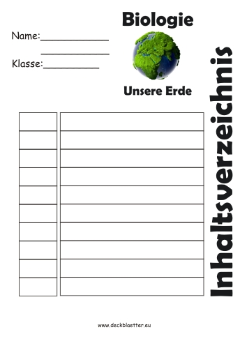 Biologie Unsere Erde Inhaltsverzeichnis Vorlage für das Schulfach Biologie - Deckblatt Biologie Unsere Erde Inhaltsverzeichnis zum ausdrucken.