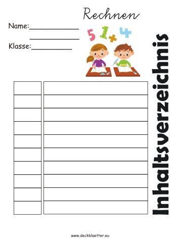 Inhaltsverzeichnis Rechnen Vorlage für das Schulfach Mathe - Deckblatt Inhaltsverzeichnis Rechnen zum ausdrucken.
